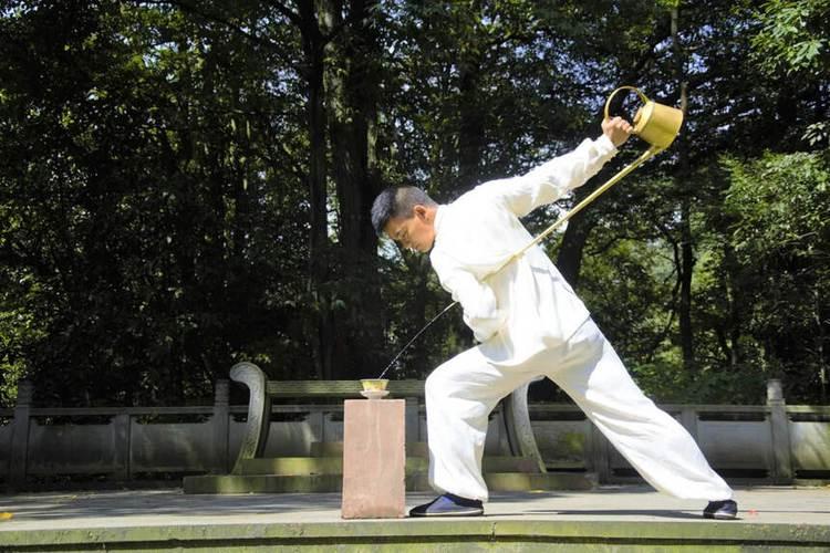 执壶人将一把长嘴铜壶灵巧转动,一式“吉龙进宝”将长嘴铜壶的长嘴托在臂弯之上,一倾,滚热的开水顺管而下,无误入杯,茶壶往上一收,水流利落止住。执壶人拎着壶转过身,一个下腰的动作,长嘴铜壶举过头顶,从前往后倒,水依然落入盖碗中,茶叶被冲散开并跟随水流转动起来,这是一式“龙转乾坤”,寓意着“极度困境,幽谷